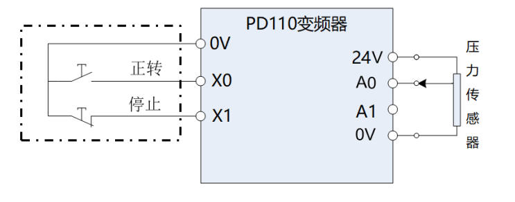 ② Penyongsang PD110 disambungkan ke terminal X0 dan X1 seperti yang ditunjukkan dalam rajah berikut (hanya satu daripadanya boleh disambungkan mengikut keperluan tapak, X0 dan X1 mempunyai isyarat di masa yang sama, dan kemudian berhenti dan laksanakan mengikut X1);