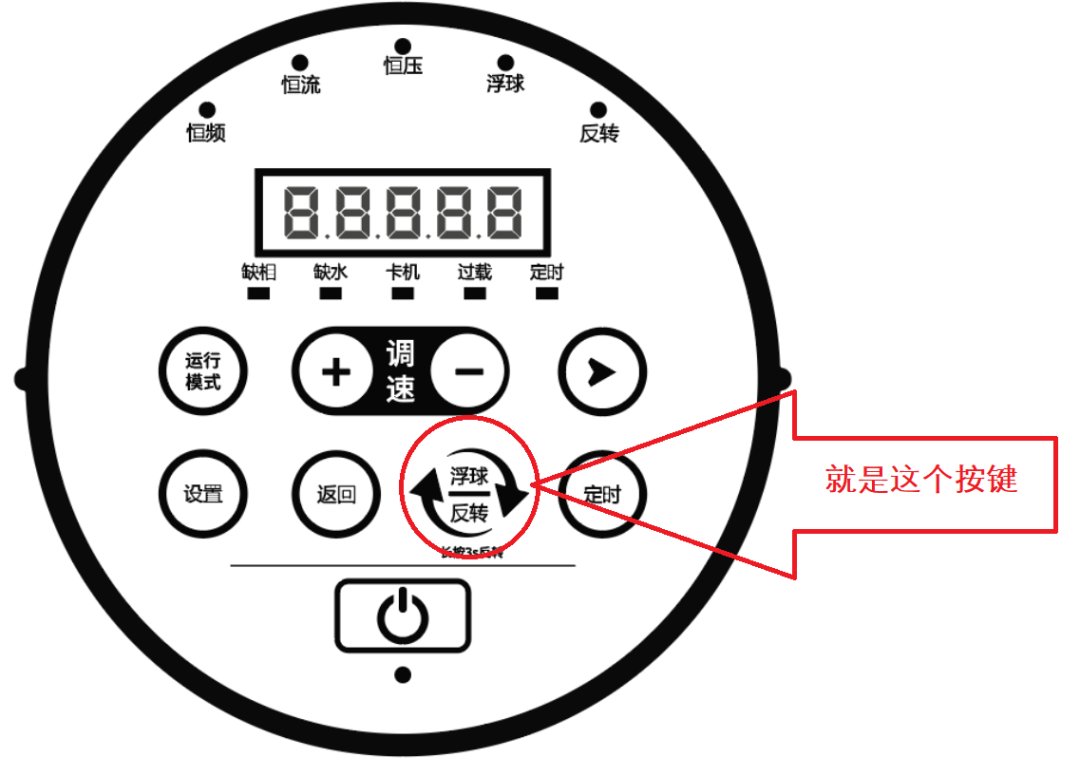 ③ Tekan kekunci "float reversal" untuk mengaktifkan fungsi; Penukar frekuensi berjalan mengikut keadaan bola terapung, dan lampu berjalan menunjukkan keadaan berjalan (hidup tetap menunjukkan bahawa ia sedang berjalan).